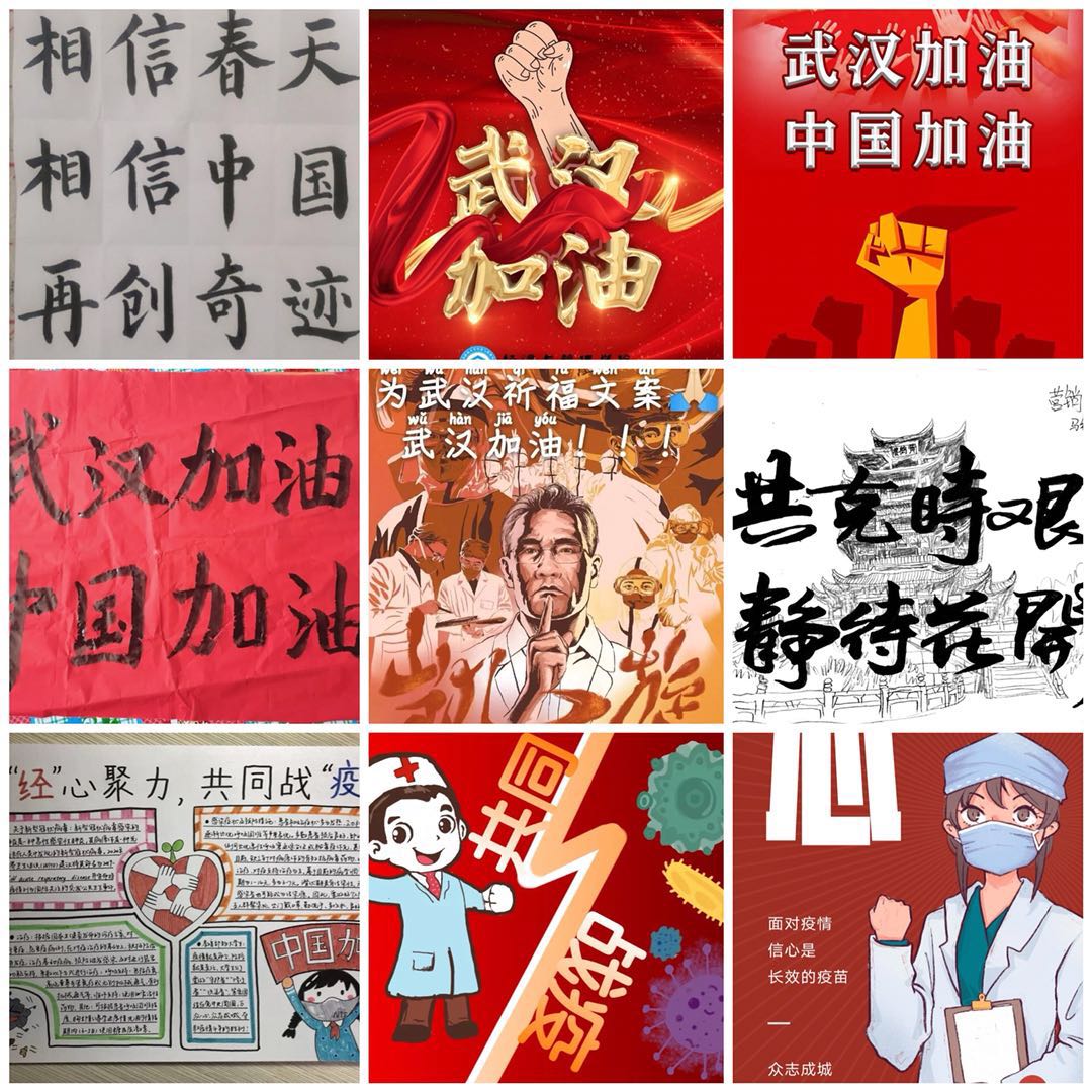 共收到涵盖书法、绘画、视频、海报设计、手抄报创作等艺术形式的艺术作品128件。其中,财务192班宋首霖的楷体书法,书写苍劲有力,内容激扬斗志,以方正之势彰显了“翰墨传祝福,同心战疫情”的决心;国贸192班张书榕在海报中绘出了共援武汉的希望之手,以海报的形式表达了中国人民万众一心、共克疫情的坚定信念;国贸171班王熙媛将医护人员和新型冠状病毒绘以卡通人物形象,以手抄报的形式在普及防疫知识的同时,表达了中国人民战胜疫情的决心。