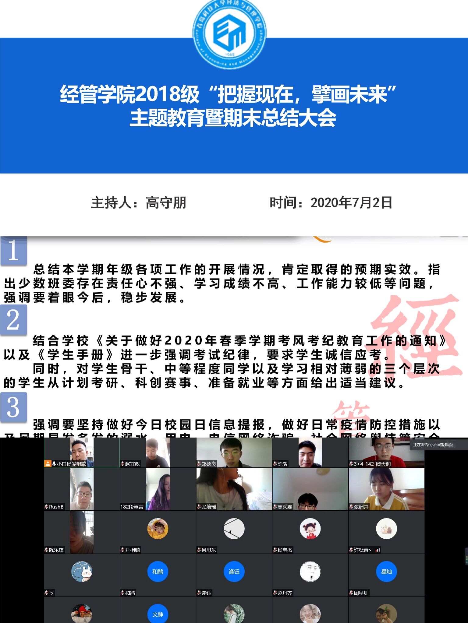 2018级本科生通过线上分批次分专业召开“把握现在,擘画未来”主题教育暨期末安全文明教育、诚信考风考纪大会。本次会议由2018级辅导员高守朋老师主持,18级全体学生线上参加。
