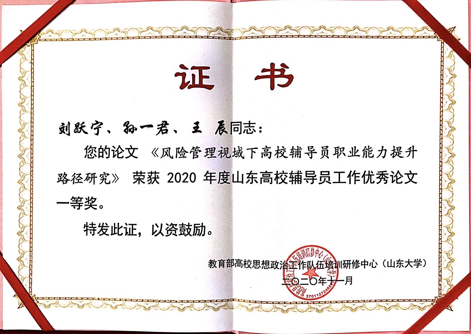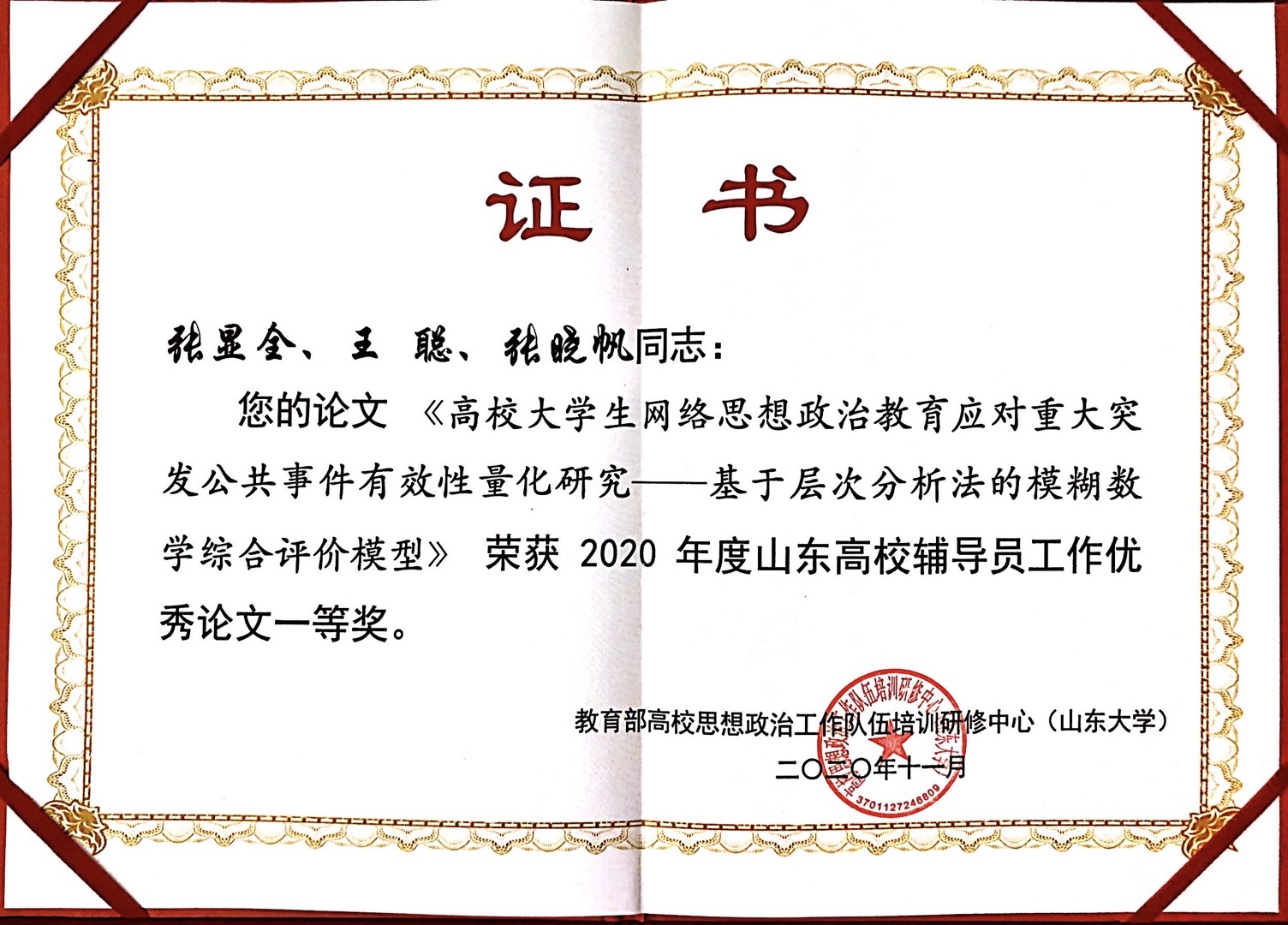 刘跃宁、孙一君、王辰撰写的《风险管理视域下高校辅导员职业能力提升路径研究》,张显全、王聪、张晓帆撰写的《高校大学生网络思想政治教育应对重大突发公共事件有效性量化研究——基于层次分析法的模糊数学综合评价模型》两篇论文获得一等奖,获奖数量和质量均有重大突破。