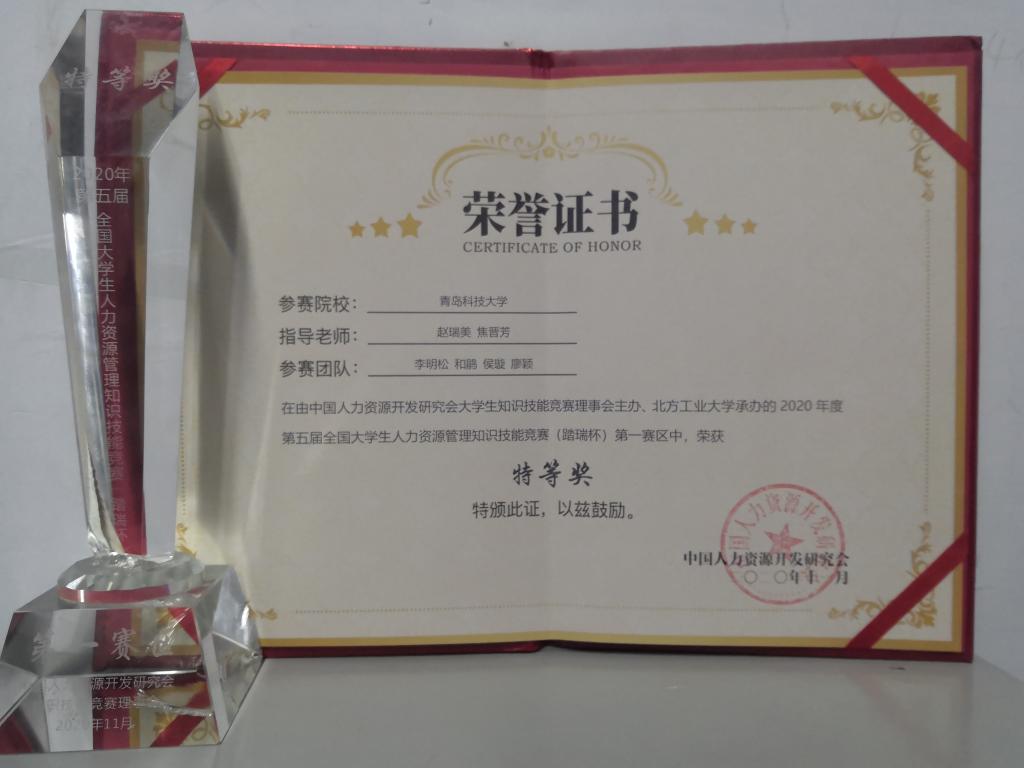 该赛是面向全国人力资源管理专业开展的技能大赛,大赛环节紧扣人力资源管理专业知识,人力资源规划、培训与开发、薪酬管理、绩效管理、员工关系管理等专业知识,旨在实践中考验学生的理论功底和实践能力。决赛以线上的方式进行,比赛围绕人力资源理论知识、情景实操等内容,选手们在带队老师的指导下,凭借自己的专业素养和临场发挥水平,以踏瑞公司开发的软件为主模拟公司经营与决策,最终以过硬的专业本领赢得决赛一等奖。