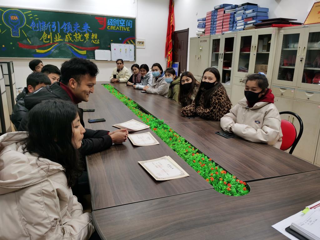 老师们的关心表示感谢并逐一发言,就一学期以来自己在课程学习、日常生活、兴趣爱好、未来发展等方面的感悟畅所欲言,同时提出自己目前尚存的学习困难,并针对“短板”科目做出寒假学习规划。付凯和王世杰针对同学们提出的问题一一做出解答,帮助大家排忧解难,现场交流气氛温暖而融洽。国际经济与贸易专业的努斯热提·艾拜同学表示,这一学期自己加入大艺团,积极参与北京赛车PK10