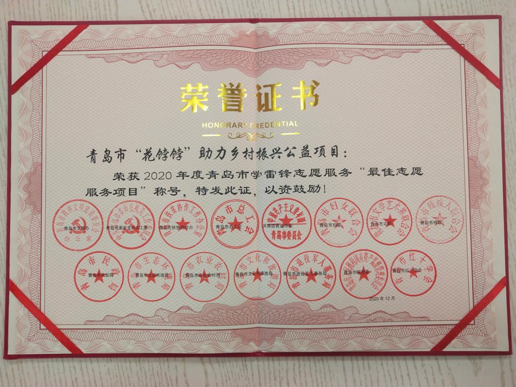 学子长期运作的“花饽饽”助力乡村振兴公益项目获2020年度青岛市学雷锋志愿服务“四个100”先进典型——最佳志愿服务项目。