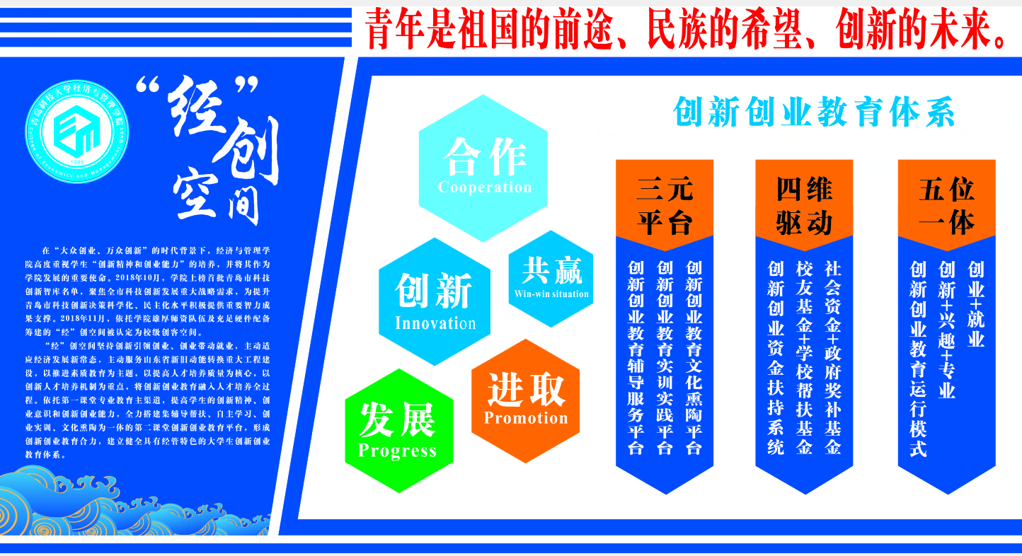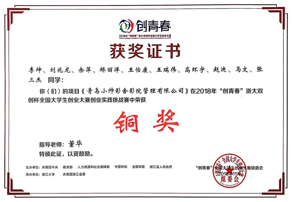荣获“创青春”全国铜奖1项,“创青春”MBA专项赛全国铜奖1项。“三创赛”全国一等奖1项、二等奖2项、最佳创新奖1项,山东省“创青春”金奖1项,山东省“挑战杯”三等奖3项,累计获批国家级大学生创新创业立项3项,省级大学生创新创业立项4项,校级大学生创新创业立项40项。在北京赛车PK10