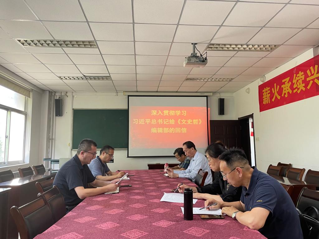 组织召开《深入学习贯彻习近平总书记给< 文史哲>编辑部的回信》专题会议,全面深刻理解习近平总书记对于弘扬中华文明、繁荣学术研究方面的重要指示精神。副院长吕承超主持会议,院长李勋来及教师代表参与学习。