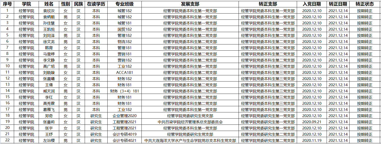 本科生党支部、研究生党支部于2021年12月14日召开预备党员转正大会讨论袁欣汝等22位同志的转正问题,同意以上同志按期转为中共正式党员,现将该22名同志情况予以公示。公示期为2021年12月14日至2021年12月21日。如有异议,请于公示期内到北京赛车PK10