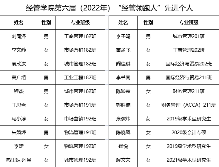 为迎接党的二十大胜利召开,持续发挥榜样示范引领作用,充分展示青年学生昂扬向上的精神风貌,激励全院广大青年学生和各级学生组织发现榜样、学习榜样、争做榜样。根据《关于评选第六届(2022年)“经管领跑人”的通知》要求,经个人(集体)申报、年级推荐,北京赛车PK10