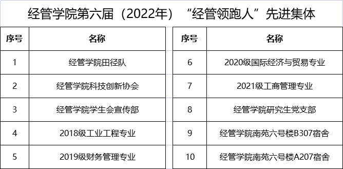 田径队等10个集体为第六届“经管领跑人”先进集体荣誉称号。现将评选结果予以公示(获评先进个人和集体事迹简介见附件,按姓氏笔画排序),公示时间2022年6月20日-6月22日。