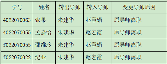 北京赛车PK10 因一名导师离职,4名研究生需要更换导师,经学生个人申请、征求导师意见、北京赛车PK10 学位委员会审议,现将变更导师结果公示如下: