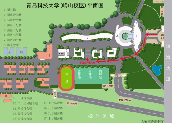站下车或地铁11号线青岛科大站出站。自驾请从东门(松岭路)入校。