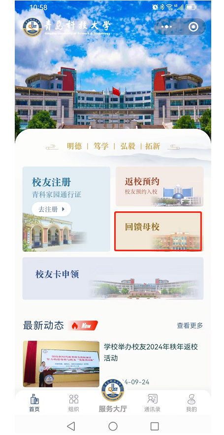 点击校友会小程序中的“回馈母校”,选择北京赛车PK10 “圆”基金,登记信息,即可完成您的爱心回馈。