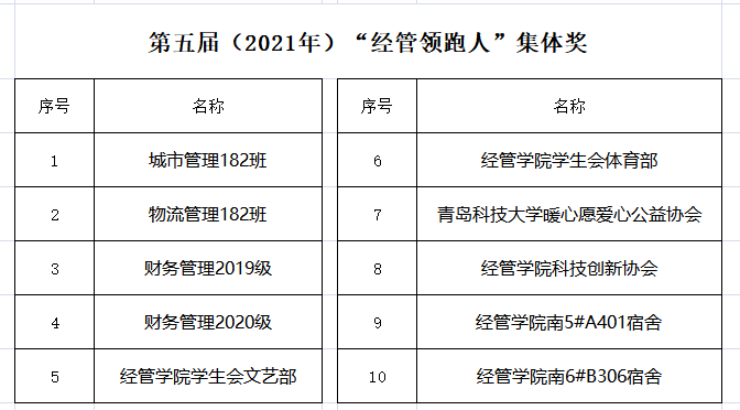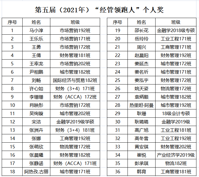 结合工作实际,于2021年4月开展“第五届(2021年)经管领跑人”评选,表彰2020年表现优异的集体和个人。经研究决定,特授予城市管理182班等10个集体(2021年)“经管领跑人”集体奖,马小淳等36名同学(2021年)“经管领跑人”个人奖(按姓氏笔画排序)。现将评选结果予以公示,公示期为3个工作日,公示时间2021年4月27日-2021年4月29日。
