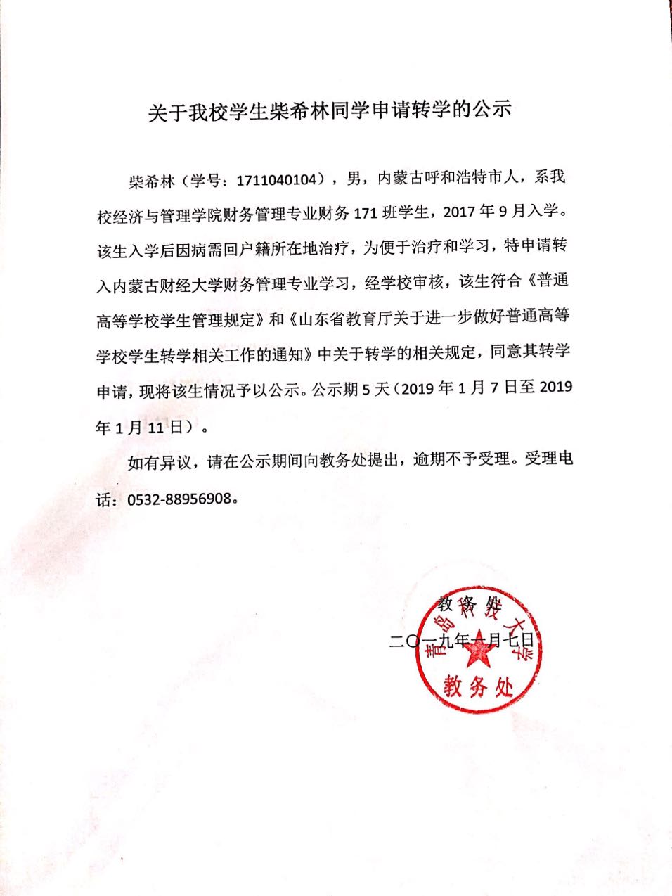 关于北京赛车PK10 学生柴希林同学申请转学的公示