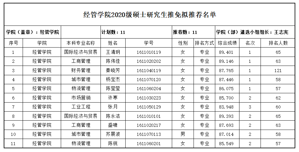2020级硕士研究生推免拟推荐名单公示如下,公示期3个工作日,公示时间:2019年9月10日-2019年9月12日。