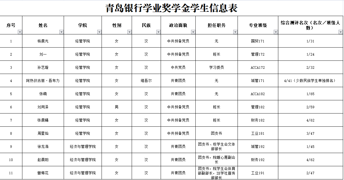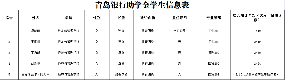 《2020年度青岛银行奖助学金的通知》的要求,经个人申请、材料审核,结合前期奖助学金获得情况,现对青岛银行奖助学金获得者予以公示,公示期3个工作日,公示时间2021年3月31日-2021年4月2日。