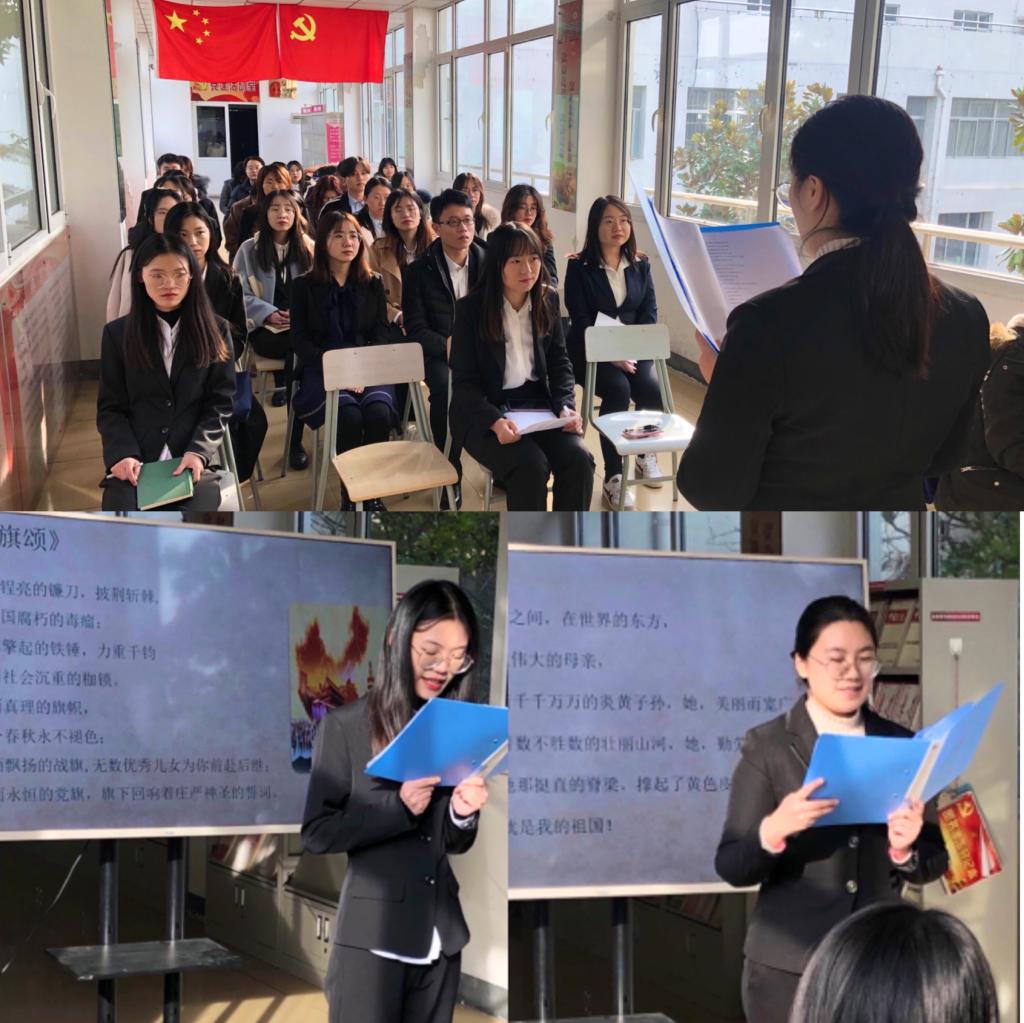 开展了“诵读红色经典,传承红色精神”朗读活动,三位先锋朗读者分别朗读了《党旗颂》、《这,就是我的祖国》以及《我和我的祖国》,借此回顾红色历史,发扬模范精神。三位党员用铿锵有力的声音传递坚定信仰、坚守家国情怀。全体党员在学经典、品经典中增强了爱党爱国爱社会主义情感,深切感受革命先烈们对理想信念的执着追求、对党绝对忠诚的赤子之心、舍生取义的崇高气节和报国为民的炽热情怀。全体党员共同表示:“作为新时代的青年党员,要珍惜这个时代、担负时代使命,要有人民情怀、实干情怀和进取情怀,自觉为实现中华民族的伟大复兴贡献自己的青春力量。”