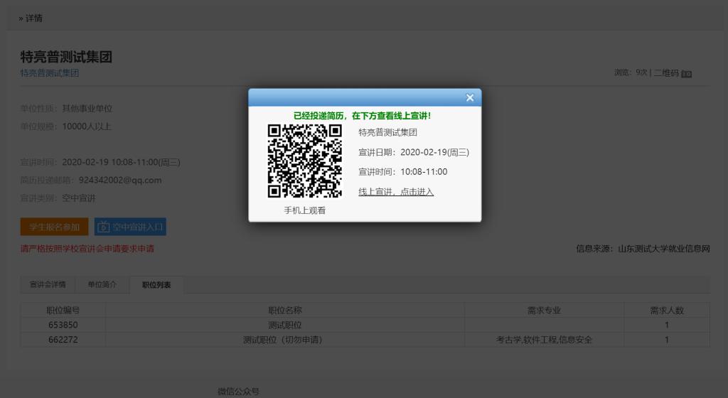 3)可以在公布的宣讲时间点,点击“空中宣讲会入口”,按照页面弹窗提示,进入单位空中宣讲。或手机扫码观看宣讲。