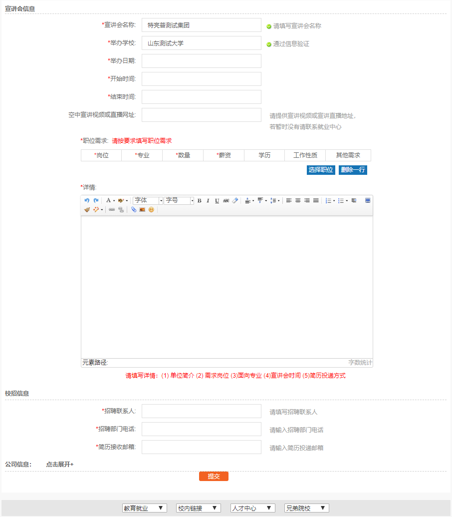 进入空中宣讲会填写页面,按页面要求填写空宣详情信息,填写完成后,点击提交。单位宣讲申请信息将等待北京赛车PK10