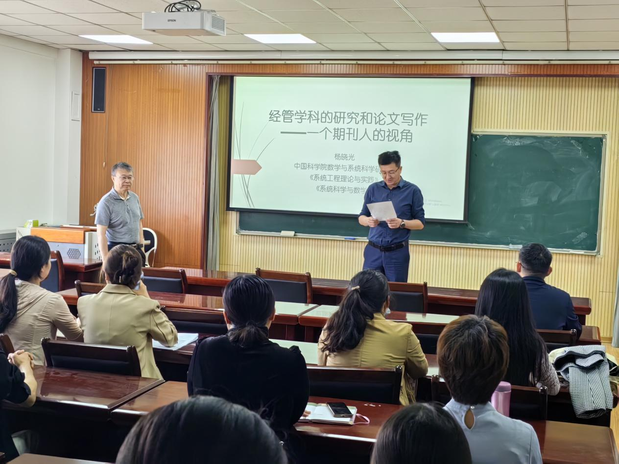 杨教授用简洁幽默的语言和生动形象的比喻一个期刊人的视角为大家进行了经管学科的研究和论文撰写的讲解。首先,他强调撰写论文要引领热点,而不是跟踪热点,要筛选有价值的选题。在进行论文写作中,要感知现实世界,也要把握研究价值。他表示做研究的过程就好似勘查“案发现场”,要细致入微,发现差距和研究的深层意义。其次,要厘清研究范式。要确定研究在学术探索海洋中的位置,明确自己研究的新的贡献点。再次,清晰的研究方案也是撰写论文必不可少的环节。应该能够提供问题研究重要性的充分资料,避免“伪命题”的产生。最后,也要厘清研究的边际贡献。杨教授引经据典,对论文撰写的内容和研究角度进行了深入浅出的分析和总结。另外,教授还总结了科学研究的四条准绳,各类文章的基本要求等,与会师生受益匪浅。