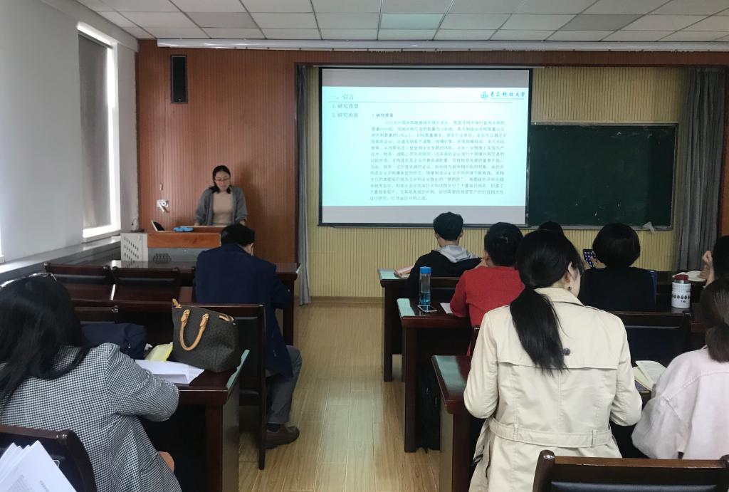 论坛开始,刘小凤同学对自己的论文进行精彩的阐述,其主要内容主要包括研究的背景及内容、文献综述、理论分析及研究假设、研究设计以及实证结果。她详细地解释自己所做的假设、数据来源与处理以及研究模型,以此选择了变量,并进行了描述性统计、相关性分析和回归分析,最终得出实证结果。随后,杨继梅老师根据学生的研究思路,指出其需要用经济学的方法来进行研究,并且要及时更新论文的分析方法,与时俱进。其他老师们也针对刘小凤同学论文中存在的问题进行了讨论,并根据学生的研究方向给予了专业的建议和改正的思路。
