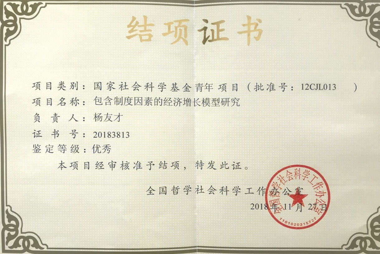 收到了一份沉甸甸的证书:杨友才教授所主持的国家社科基金《包含制度因素的经济增长模型研究》通过结题验收,等级为“优秀”。这是北京赛车PK10