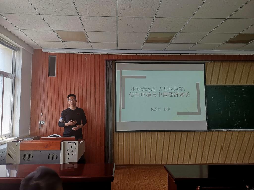 师生分享了一篇题为“信任缓环境与中国经济增长”的论文。杨教授研究制度经济学多年,擅长将经济学概念纳入数理模型中并进行合理的推导,此论文是一篇以抽象概念“信任”为主题的数理模型推导论文。首先,杨教授以一句古语“相知无远近,万里尚为邻”生动地引出了“信任”的背景,提出该论文的主要创新点是构建一个“信任环境”,分别研究该环境对个人收入和中国经济增长产生的影响。然后,他从数理模型推导和模型实证两方面出发,系统地阐述了论文的主要内容,使师生们更深入地了解该论文的模型构建过程和主要贡献。通过实证结果他发现,信任水平对人均收入和经济产出确实有显著的正向影响,因而在以后的研究中,我们应该充分考虑到信任因素的有效作用。