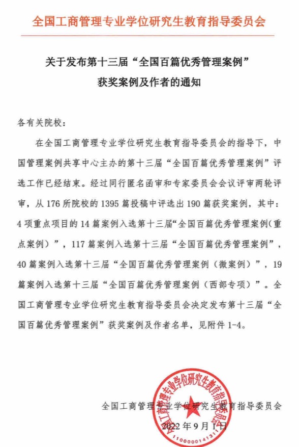 9月1日,由全国工商管理专业学位研究生教育指导委员会主办,中国管理案例共享中心负责组织的第十三届“全国百篇优秀管理案例”获奖名单公布。北京赛车PK10