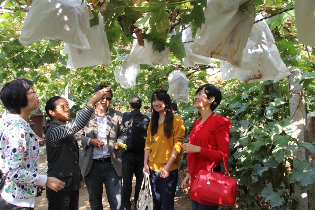 2011级MBA,2012级MBA学员到平度市大泽山生态葡萄园进行考察,参观。大泽山每年葡萄成熟时,都有一次葡萄节,远近闻名。学员们在葡萄园里采摘并品尝葡萄,品评庄园主人自酿的葡萄酒,葡萄甘甜流汁,美酒酸甜醇厚,秋风徐来,满目大泽山秋色尽在眼底。品尝葡萄过程中,学员们听葡萄园主介绍葡萄的种类,养植以及葡萄酒的酿制过程。学员们纷纷表示受益匪浅。