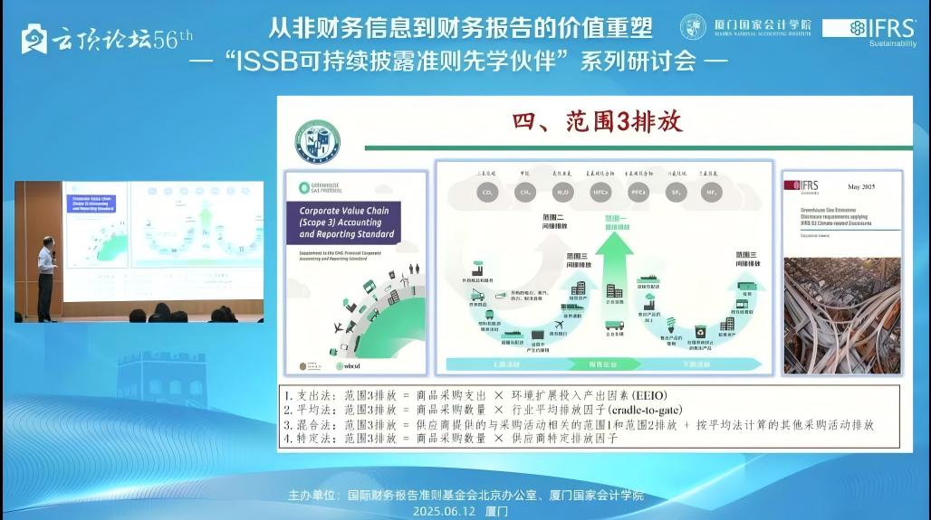 黄教授主要从国内外新进展、重要性评估、预期财务影响及范围3披露四个方面展开演讲。首先,从六大报告框架梳理了财务报告披露的发展框架,介绍了国内建设可持续披露准则和鉴证准则的两大准则体系情况。