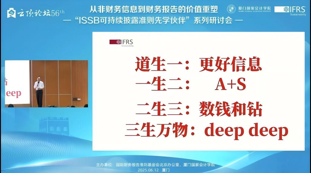 张主任讲述了财务会计的发展变革与非财务信息的重要性,强调了非财务信息到财务报告的惊现一跳至关重要。从道家的“道生一,一生二,二生三,三生万物”来比喻当前会计披露的发展及未来前景。