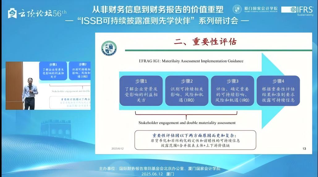 然后,黄教授从财务重要性与影响重要性的底层逻辑引入双重重要性评估的具体内容,给出具体步骤及复杂的原因。指出双重重要性要结合风险机遇与正面和负面影响进行评估。