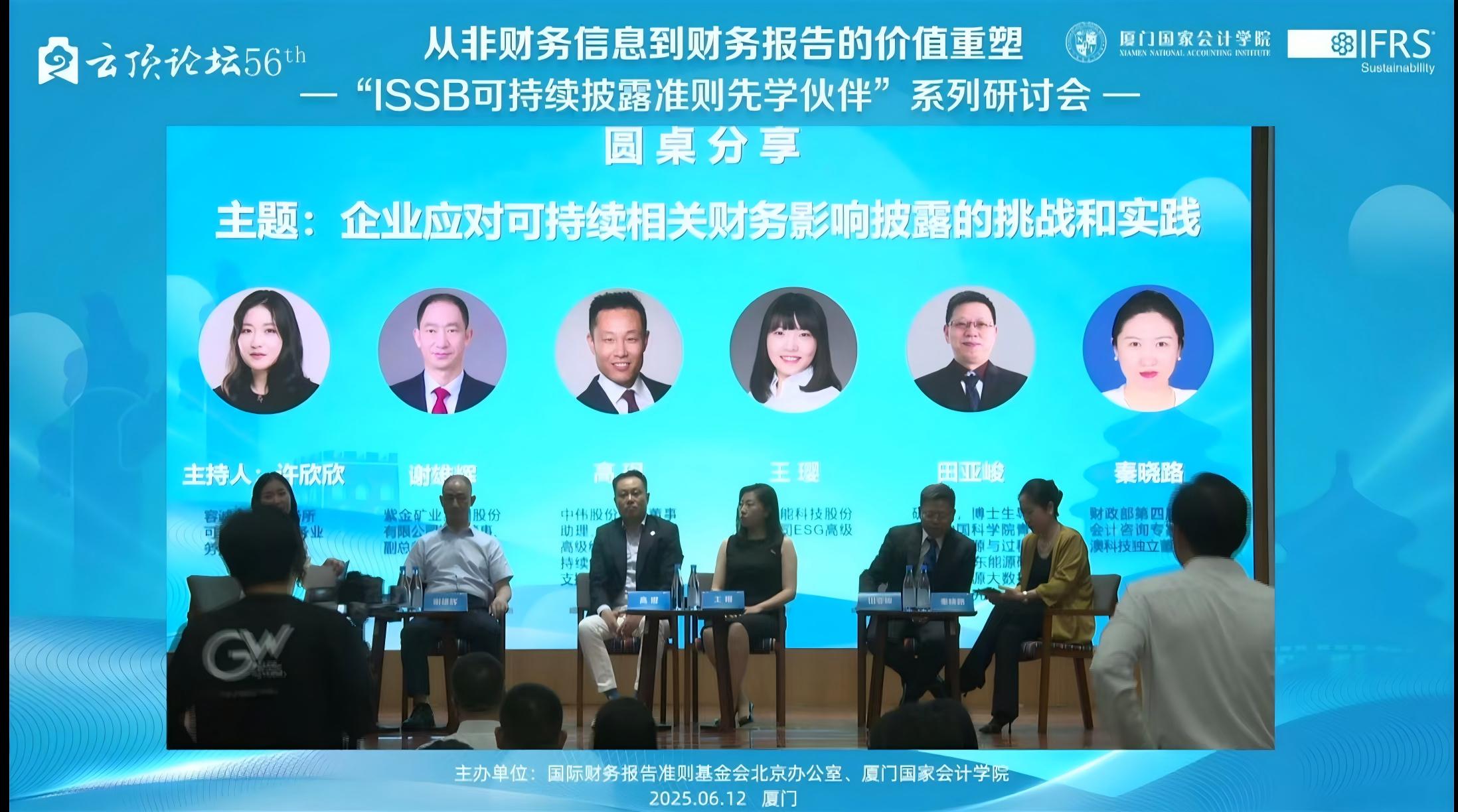 在短暂茶歇过后,研讨会进入圆桌分享环节,以“企业应对可持续相关财务影响披露的挑战和实践”为主题,几位企业家与教授进行了交流分享。容诚会计师事务所可持续发展服务业务负责人许欣欣进行了该环节的主持活动,圆桌嘉有:紫金矿业集团股份有限公司执行董事、副总裁谢雄辉;中伟股份执行董事助理、可持续发展高级经理、IFRS可持续披露准则技术支持小组成员高琨;隆基绿能科技股份有限公司ESG高级经理王璎;研究员,博士生导师,中国科北京赛车PK10