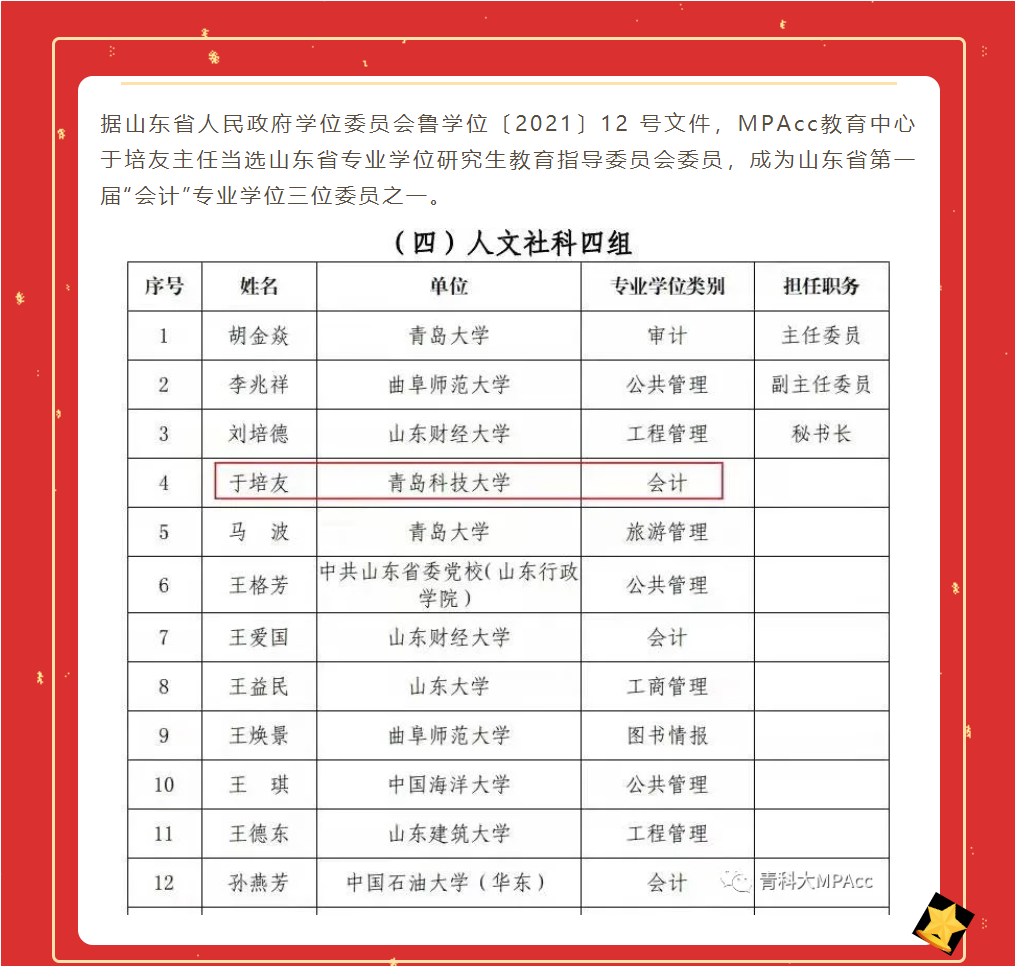 于培友当选山东省第一届专业学位研究生教指委委员