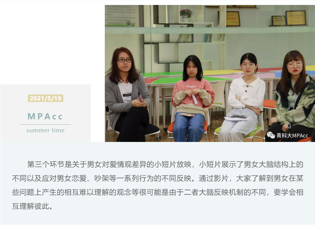 518日下午,会计硕士联合会组织了爱的魔力转圈圈主题心理团辅活动,活动内容是关于大学生爱情观的分享活动。本次团辅的目的是通过开展活动,帮助大家认识两性的心理与行为,学习与异性的沟通技巧,树立健康的恋爱观念,探索爱情的真谛。